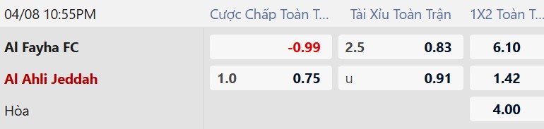 Al Ahli chấp 1 bàn là mức kèo hợp lý với chênh lệch đẳng cấp giữa hai đội. Al Fayha không còn nhiều động lực thi đấu, trong khi Al Ahli buộc phải thắng để tiếp tục bám đuổi cuộc đua vô địch. Với phong độ ổn định cùng chất lượng đội hình nhỉnh hơn, đội khách đủ sức thắng cách biệt.