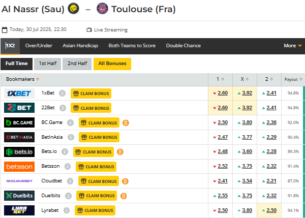 Thông tin tỷ lệ Al Nassr vs Toulouse: