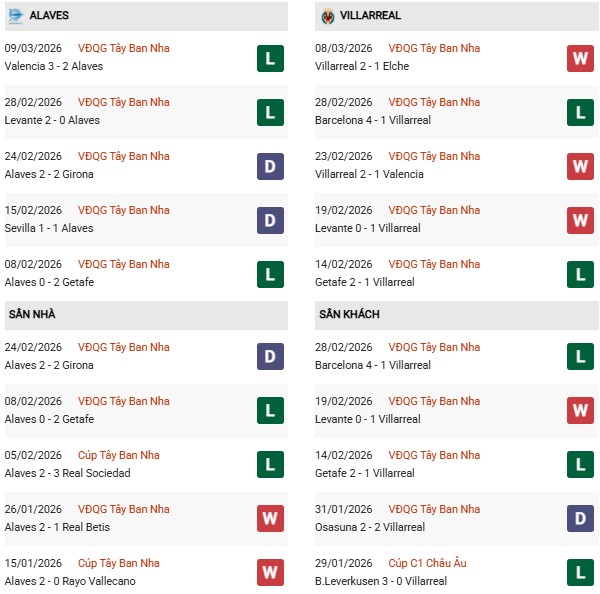 - Alaves thắng 3, hòa 2, thua 5 trong 10 trận gặp Villarreal gần đây.