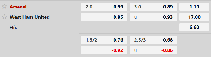 Dễ hiểu khi Arsenal đang được đánh giá cao hơn rất nhiều cùng tỷ lệ chấp lên đến ngưỡng 2 bàn. Khá thú vị khi ở 5 lần gặp nhau liên tiếp, Arsenal chỉ thắng 2 trận trong khi West Ham có đến 3 lần làm được điều tương tự. Thậm chí, Pháo Thủ ở giai đoạn này còn toàn thua trên sân nhà. Tuy nhiên với bối cảnh đội khách đang chơi quá tệ, Arsenal có thừa khả năng thắng áp đảo và thắng luôn kèo châu Á.