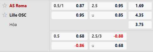 Thông tin tỷ lệ kèo bóng đá AS Roma vs Lille: