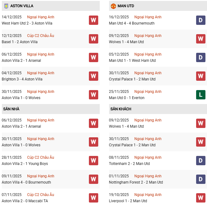 - Aston Villa thắng 1, hòa 3, thua 6 trong 10 trận gặp MU gần đây.