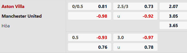 Thông tin tỷ lệ kèo bóng đá Aston Villa vs MU: