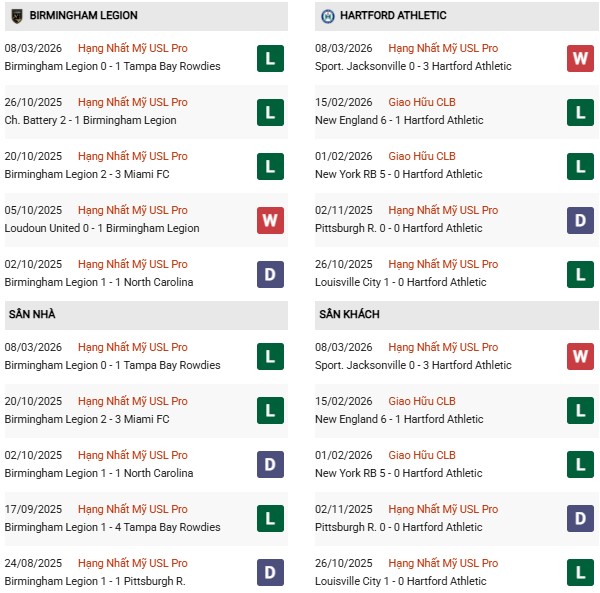 - Birmingham Legion thắng 4, hòa 2, thua 4 trong 10 trận gặp Hartford gần đây.