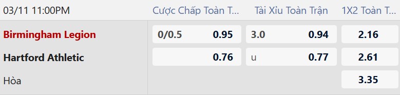 Thông tin tỷ lệ kèo Birmingham Legion vs Hartford: