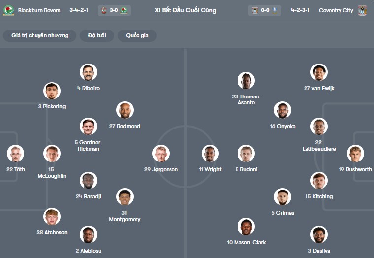 Đội hình dự kiến Blackburn vs Coventry: