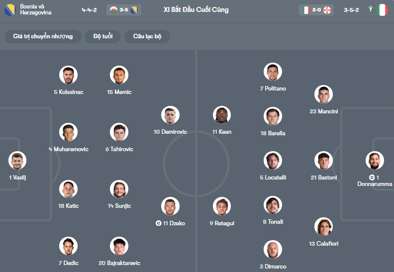 Thông tin lực lượng Bosnia vs Italia: