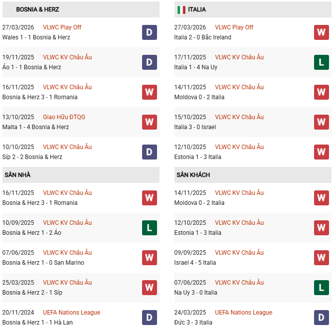 - Trên sân nhà, Bosnia thua cả 2 trận trước Italia.