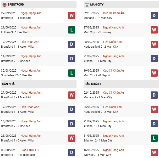 - Trên sân nhà, Brentford thắng 1, thua 2 trước Man City.