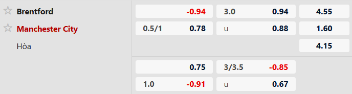 Thông tin tỷ lệ kèo bóng đá Brentford vs Man City: