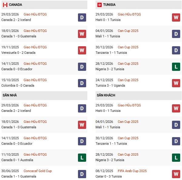 Thống kê phong độ Canada vs Tunisia: