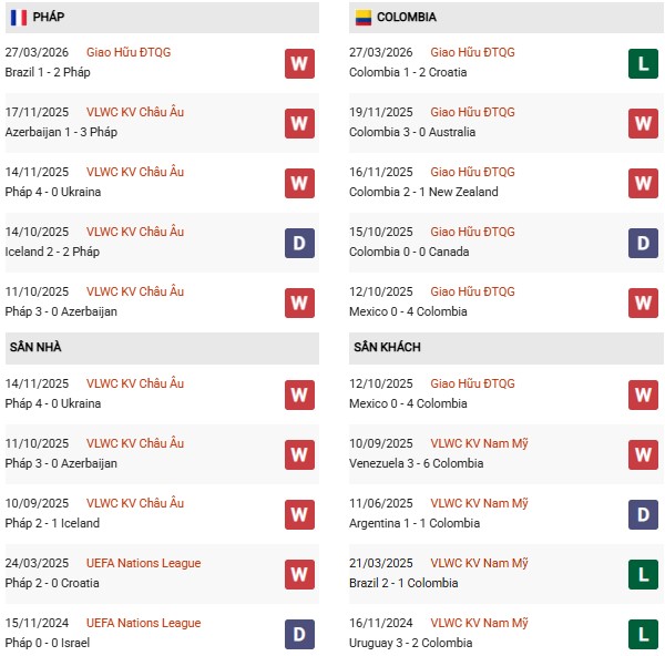 - Colombia thắng 1, thua 2 trong 3 trận gặp Pháp gần đây.
