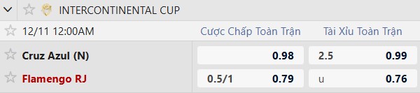 Dự đoán Cruz Azul vs Flamengo, 00h00 ngày 11/12, vòng 2 Intercontinental Cup, sân Ahmad bin Ali. Việc Flamengo nhận mức chấp lên tới 3/4 bàn (có thể tăng lên -1) cho thấy giới chuyên môn không tin sẽ xảy ra bất ngờ.