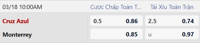 Thông tin tỷ lệ cược Cruz Azul vs Monterrey: