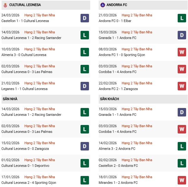 - Cultural Leonesa thắng 1, hòa 3 trong 4 trận gặp Andorra gần đây.