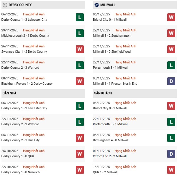 - Trên sân nhà, Derby County thắng 3, thua 6 trước Millwall.