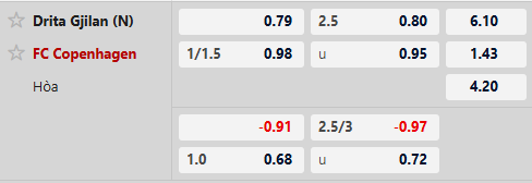 Thông tin tỷ lệ kèo Drita Gjilan vs Copenhagen: