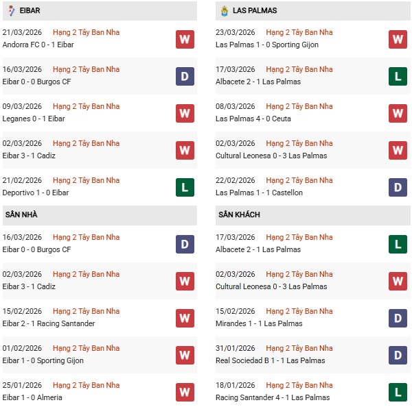 Thống kê phong độ Eibar vs Las Palmas: