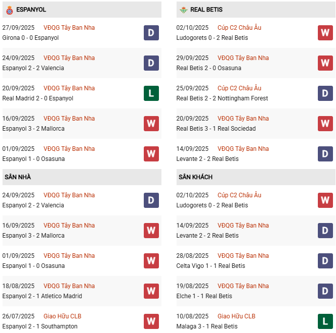 - Espanyol thắng 1, hòa 4, thua 5 trong 10 trận gặp Real Betis gần đây.