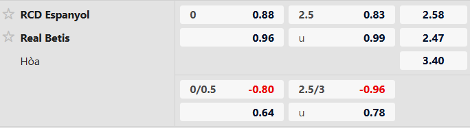 Tỷ lệ kèo hòa được thua xuất hiện ở trận đấu này. Phong độ của Betis đang "ăn đứt" Espanyol. Espanyol có lợi thế sân nhà nhưng lại thua kém khá xa so với Betis. Có khả năng, đội khách sẽ có 3 điểm ở trận này.