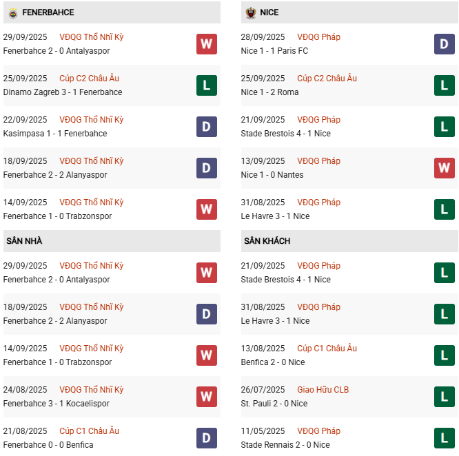 Thành tích đối đầu Fenerbahce vs Nice: