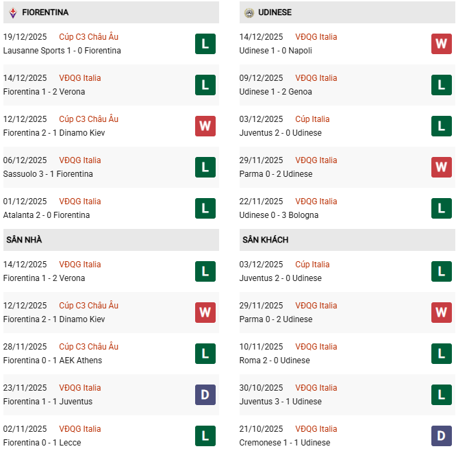Có lẽ sẽ không dễ dàng cho Fio khi Udinese có phần nhỉnh hơn ở 4 lần đối đầu gần nhất tại sân Artemio Franchi với 2 chiến thắng, 1 trận hòa và chỉ 1 thất bại.