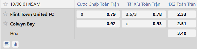 Thông tin tỷ lệ kèo Flint Town vs Colwyn Bay: