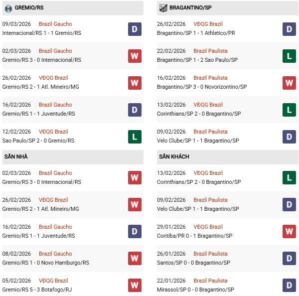 - Trên sân nhà, Gremio thắng 2, thua 1 trước Bragantino.