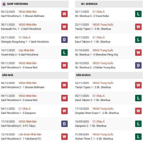 Thống kê phong độ Hiroshima vs Shanghai Shenhua: