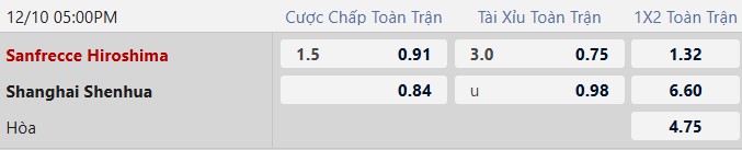 Thông tin tỷ lệ cược Hiroshima vs Shanghai Shenhua: