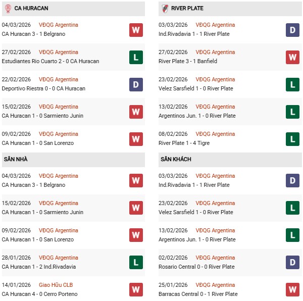 Thống kê phong độ Huracan vs River Plate:
