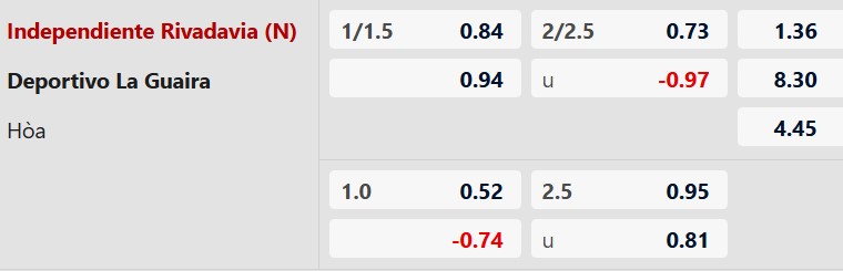Thông tin tỷ lệ cược Ind. Rivadavia vs La Guaira: