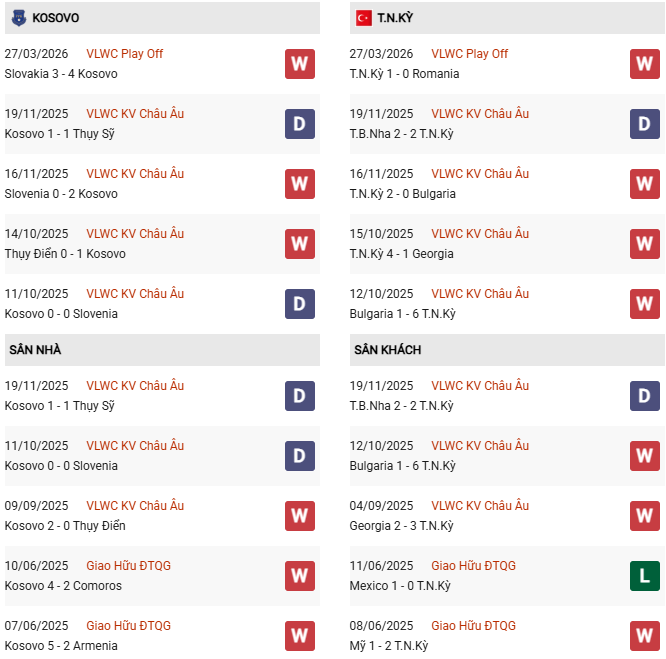 Thống kê phong độ Kosovo vs Thổ Nhĩ Kỳ: