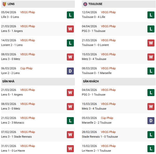 - Trên sân nhà, Lens thắng 6, thua 3 trước Toulouse.
