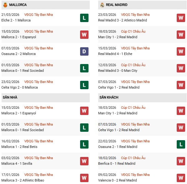 - Mallorca thắng 1, hòa 1, thua 8 trong 10 trận gặp Real Madrid gần đây.