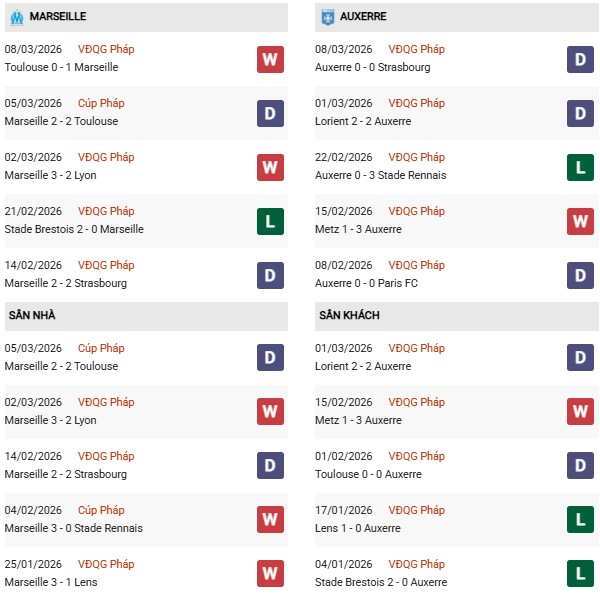 - Trên sân nhà, Marseille thắng 6, thua 3 trước Auxerre.