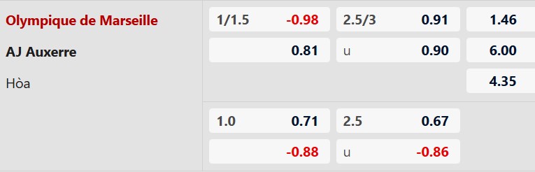 Thông tin tỷ lệ kèo bóng đá Marseille vs Auxerre: