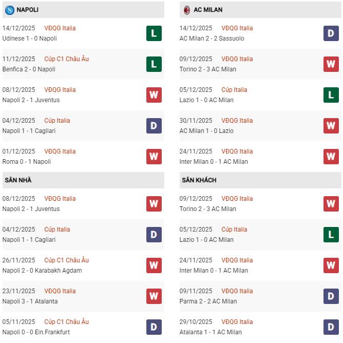 Thống kê phong độ Napoli vs Milan: