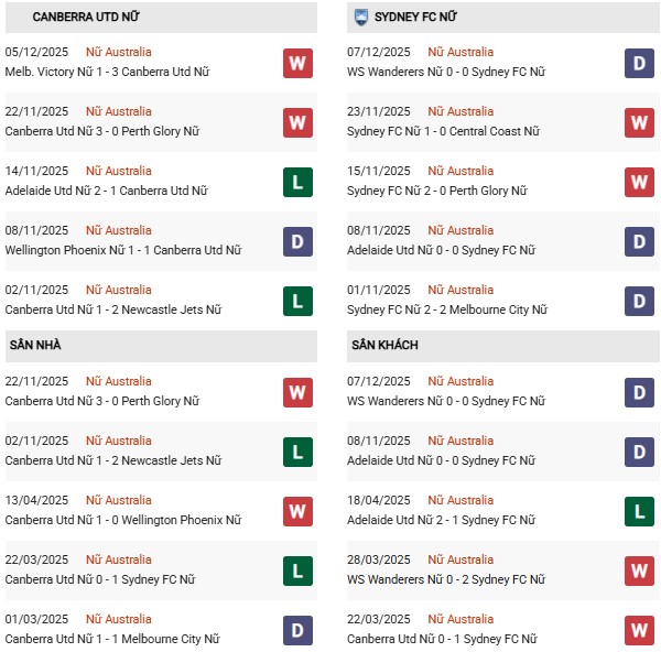 Thống kê phong độ Nữ Canberra United vs Nữ Sydney FC: