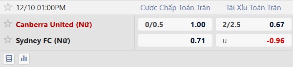 Thông tin tỷ lệ kèo Nữ Canberra United vs Nữ Sydney FC:
