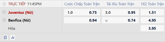 Thông tin tỷ lệ kèo Nữ Juventus vs Nữ Benfica: