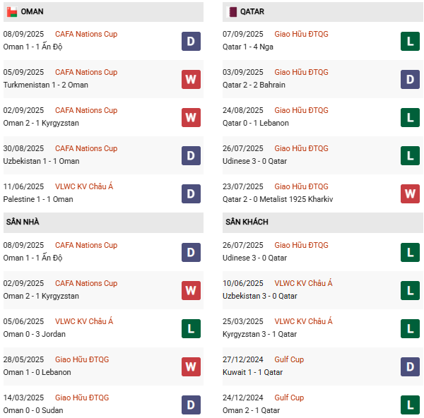 Thống kê phong độ Oman vs Qatar:
