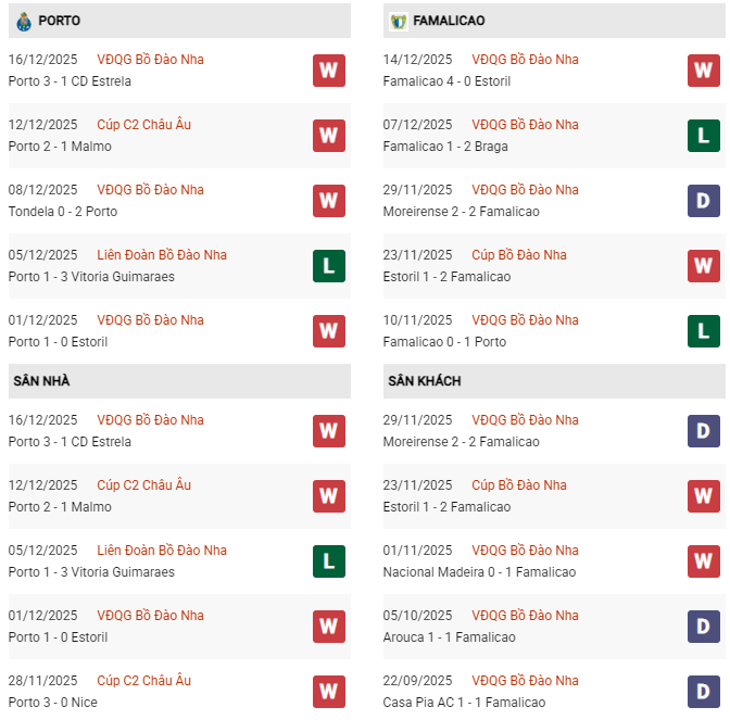 • Đối đầu trực tiếp: Trong lần gặp nhau gần nhất vào tháng 11/2025, Porto đã đánh bại Famalicao ngay trên sân khách với tỷ số 1-0.