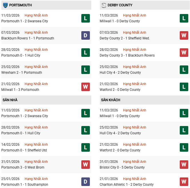 Thống kê phong độ Portsmouth vs Derby County: