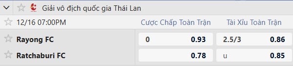 Thông tin tỷ lệ Rayong vs Ratchaburi: