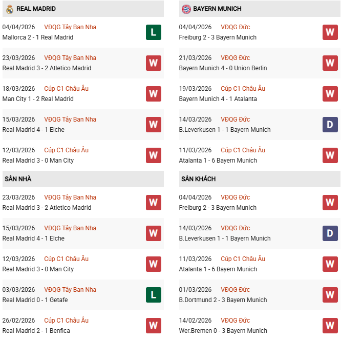 Thống kê phong độ Real Madrid vs Bayern Munich: