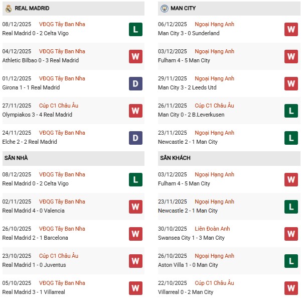 - Trên sân nhà, Real Madrid thắng 1, thua 1 trước Man City.