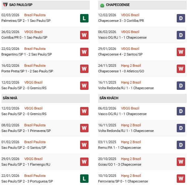 - Trên sân nhà, Sao Paulo thắng 2, thua 1 trước Chapecoense.