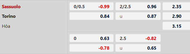 Thông tin tỷ lệ bóng đá Sassuolo vs Torino: