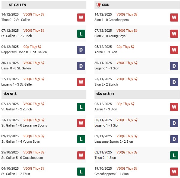 Phong độ 10 trận gần nhất của St. Gallen là khá tích cực với 5 chiến thắng, 2 trận hòa và 3 thất bại. Trên sân nhà, họ thắng 6 và thua 4 trong 10 trận gần đây, cho thấy lối chơi tương đối cởi mở, sẵn sàng tấn công nhưng cũng tiềm ẩn rủi ro nơi hàng thủ. Trước một đối thủ đang cạnh tranh trực tiếp như Sion, St. Gallen nhiều khả năng sẽ chủ động kiểm soát thế trận nhằm giành trọn 3 điểm để tiếp tục bám sát ngôi đầu.